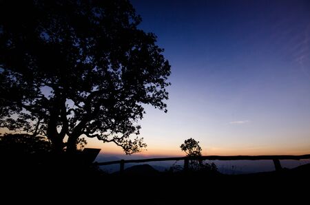 Pine tree silhouette sunset at Phu Kradueng Loei Province Thailand. Landmark of travel in Winter season.