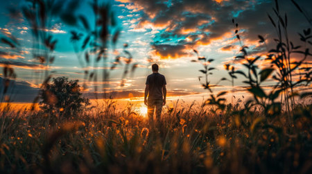 Sunset over a field with a silhouette of a family walking, a boy running, and a woman enjoying the evening sky, surrounded by nature, trees, and hills