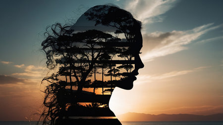 Serene forest landscape merges with woman s silhouette at sunset, creating a dreamy atmosphere