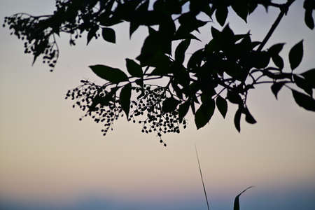 Silhouette of a tree with growing young leaves against twilight orange sky