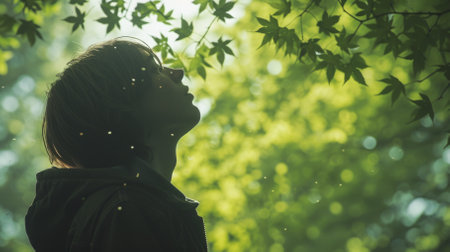 In a serene forest filled with lush greenery, a man stands silhouetted against a mystical background.