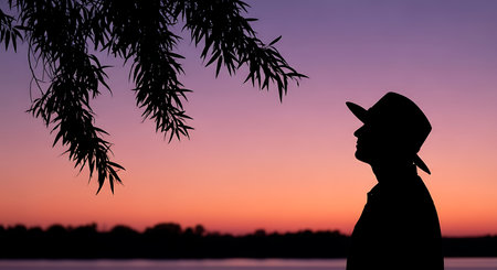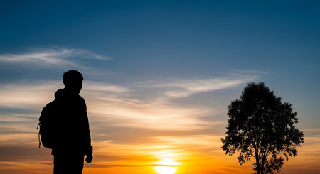 Silhouette of a person under two trees against a vibrant sunset landscape.