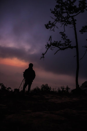 Silhouette of man sperading hand on pine tree with sunset view. Phukradung, Thailand.