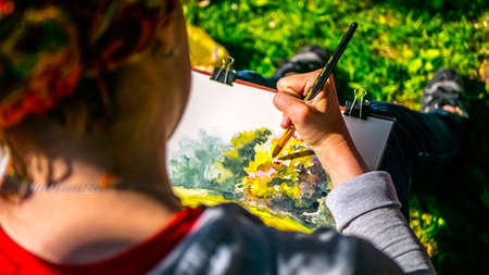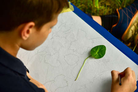 Painter teenager draws leaves in nature.