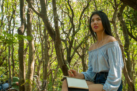 Woman relaxing with pen writing on a notebook sitting under a tree on grass in park