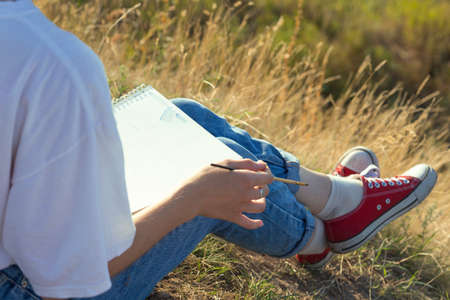 Young woman drawing with pencil in notepad while sitting on green grass, closeup