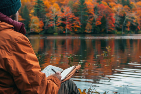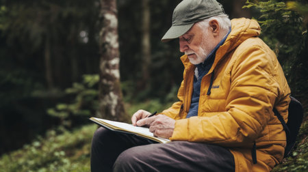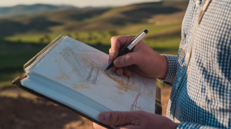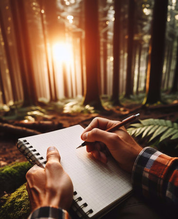 Cropped photo of a man takes notes in a paper notebook while hiking. Surrounded by natures wonders, the hiker captures his thoughts in a notebook, celebrating the essence of adventure.