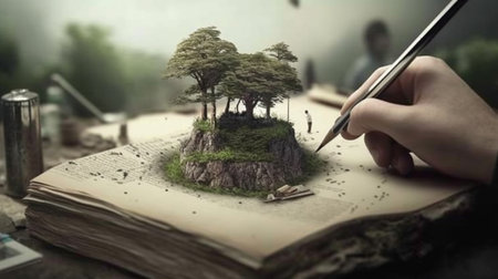 Conceptual image of a tree growing from a book in the park