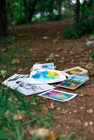 Watercolor paints on the ground in the forest. Selective focus.