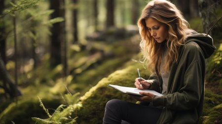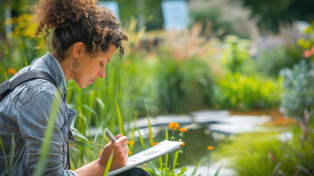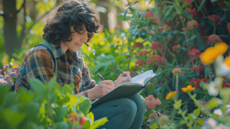 A woman is relaxing in a natural landscape garden surrounded by plants and grass, leisurely writing in a notebook while enjoying the peaceful landscape AIG50
