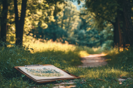 A clipboard with a drawing of a forest path lies on the grass.