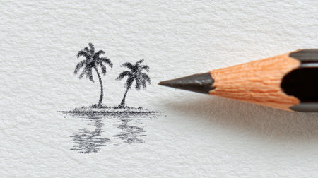 Detailed pencil sketch depicts two palm trees situated on a small island. The image showcases a tranquil scene with the reflection of the trees on the water, which also adds to the tranquil and peaceful atmosphere.