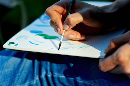 the creative process of watercolor painting. Thin brush touches the canvas