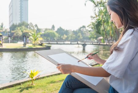 Young woman drawing in park. Theme of holidays, vacation, relaxation, tourism, education, hobby, art, seasons