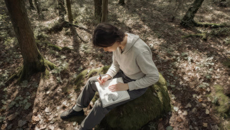 Person sketching outdoors in a sunlit forest, sitting on a moss-covered rock