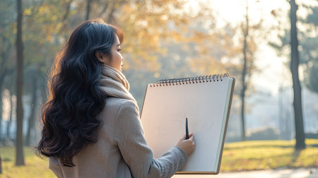 photo of a nerdy Asian woman with tanned skin and long, soft-curl black-brown hair, facing back, sketching in a large notebook, wearing a casual blazer and scarf, urban park setting, gentle morning light, medium-angle, Photorealistic, professional photo, advertising photo --no cleavage --chaos 10 --ar 16:9 --style raw --v 6.1 Job ID: 68bba995-2a17-4134-92d5-71e44acc2f87