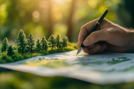 Medium shot of a planner analyzing rural site layout sketches focusing on agricultural plots and natural landscape integration for sustainable development.