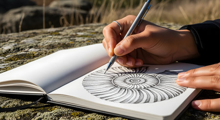 An artist's hand is captured in close-up, meticulously sketching a detailed rendering of an ammonite fossil into an open sketchbook with a mechanical pencil. The scene is set outdoors with the book resting on a large rock, indicating inspiration drawn directly from nature.