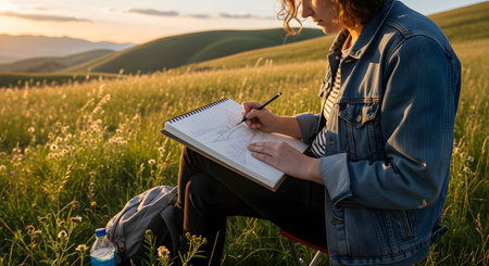 A female artist sits in a beautiful, sun-drenched meadow at golden hour, sketching the surrounding rolling hills in her sketchbook. She is focused and inspired by the serene landscape, capturing a moment of creativity, peace, and connection with nature.