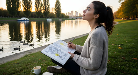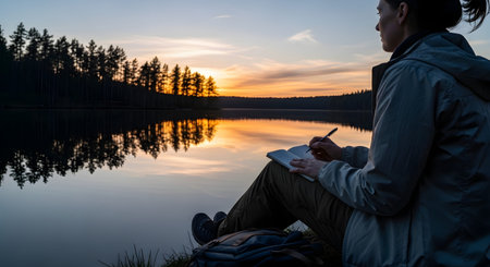 A woman sits on the edge of a calm lake at sunset, writing in a notebook with a backpack beside her. The silhouette of trees and the colorful sky create a serene backdrop for reflection and creativity.