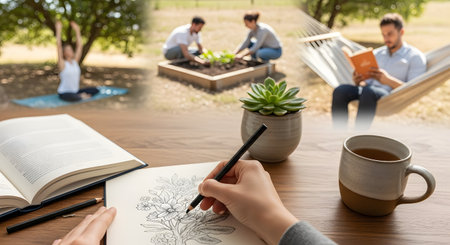 A creative collage illustrates various leisure activities and hobbies, centered around hands sketching a flower in a sketchbook. Surrounding scenes depict people enjoying yoga, gardening, and reading in a hammock outdoors, promoting a balanced and active lifestyle.