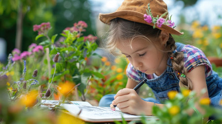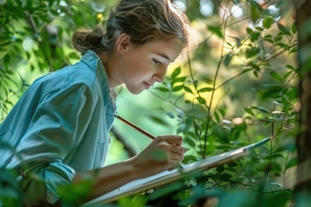 Person sketching plants in a garden during a sunny day in nature