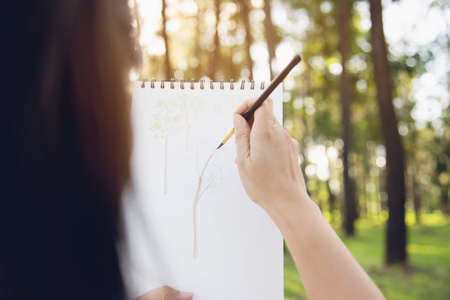 man writing a tree on sketchbook,Environment Conservative concept