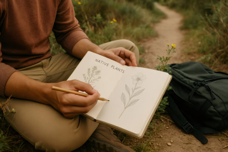 Biologist drawing native plants on sketchbook sitting in nature near a trail, wearing casual clothing