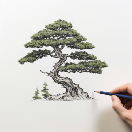 the black and white drawing depicts a flowering pine tree, showcasing eco-friendly craftsmanship. the style of the artwork resembles hyperrealistic murals, with a color palette of light green and indigo. the intricate details of the drawing include character illustrations, while the use of ink and color adds depth to the image. the photo was captured using a sony alpha a7 iii camera, and it features