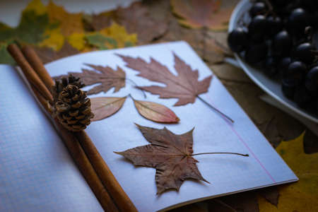 The autumn theme is back to school. The yellowed leaves lie on a notebook.