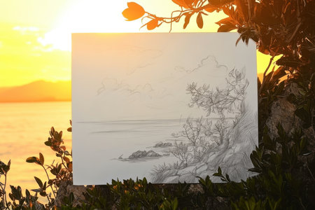Pencil sketch displays a serene coastal landscape at sunset with rocks and gentle waves.