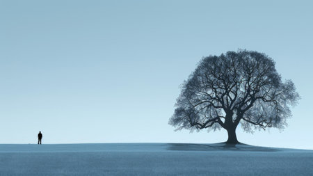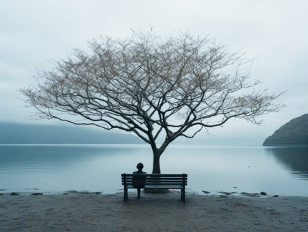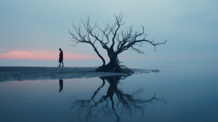 A person stands on a reflective water's edge beside a bare tree, creating a symmetrical composition in a quiet, mist-filled atmosphere. This serene image is a meditation on calmness and reflection in nature's embrace.