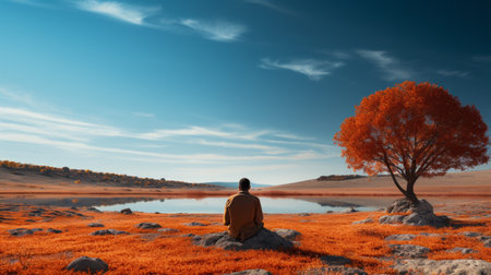 A man sits on a rock by a lake, looking out at the water. The scene is peaceful and serene, with the man's reflection in the water adding to the sense of calm. Concept of solitude and contemplation