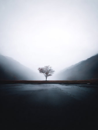 lone tree standing in a foggy landscape, with mist swirling around its branches, creating a mysterious atmosphere