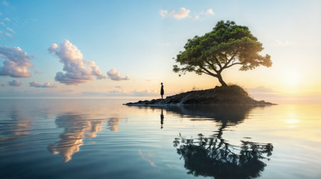 A person stands on a small island with a lone tree, surrounded by calm waters reflecting the sunset sky, creating a serene atmosphere.