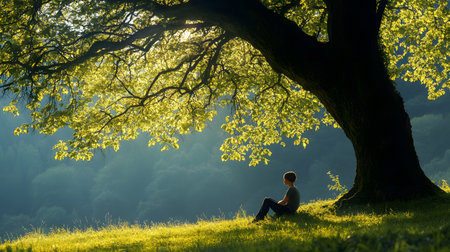 A peaceful moment of a person sitting quietly under a large tree with no devices, embracing nature. Ideal for wellness, mindfulness, and slow living themes.