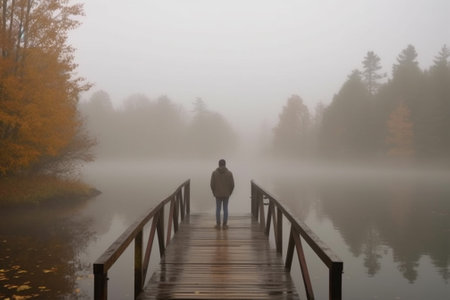 Man standing on a wooden bridge over a lake in the fog with Generative AI.