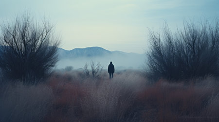 a mysterious william walks through the autumn grass on a cold morning in a desert, captured in a lo-fi, instamatic photograph. the image showcases a distant desert landscape with tall tree silhouettes and a thick layer of fog, creating a cold and atmospheric ambiance. the photo is characterized by its cold blue tones. ai generated