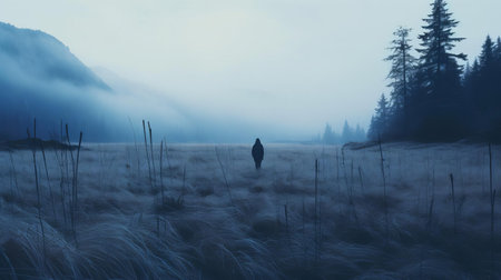 thomas walks alone through the misty autumn grass on a chilly morning, with the distant fjord landscape unfolding before him, surrounded by the silhouettes of tall trees, capturing the essence of a mystical scandinavian morning, evoking a sense of solitude and mystery in this lo-fi, instamatic-inspired photograph. ai generated