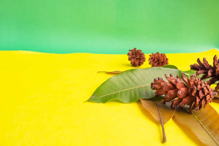 Summer Background Concept. Mango Leaves And Fir Tree Fruit Flowers On Yellow And Green Paper Background.