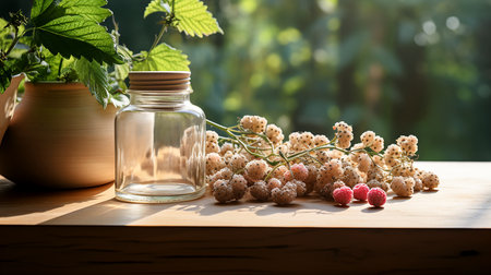 Berry composition on the table next to fortified biologically active food supplements close-up, advertising banner, illustration of vitamins and a healthy lifestyle. AI generated.