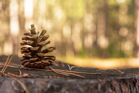 Forest fir cones on a stump. The front and back backgrounds are blurred.