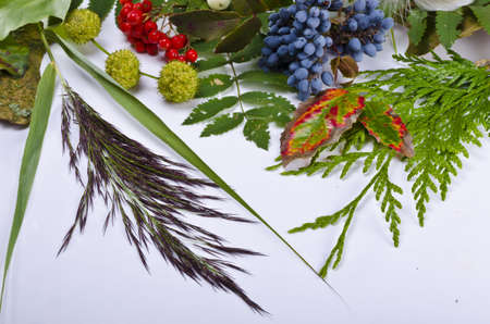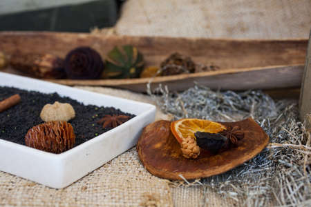In the wooden plate are lined with beautiful fruit cones, ears of grass, dried fruit details and plant branches. On the edge of the plate.