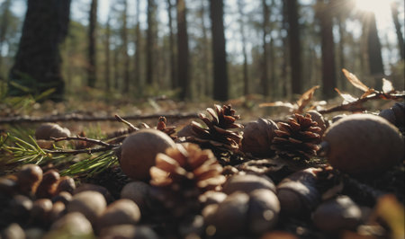 A serene close-up view of pine cones scattered on a soft forest floor, illuminated by gentle light filtering through trees, capturing nature
