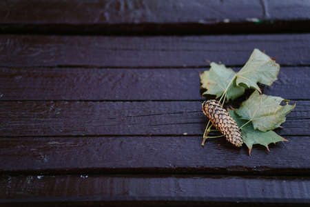Close up of a tree stump with cones and autumn leaves. Autumn background with copy space. Forest walks and wildlife