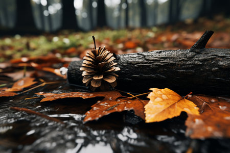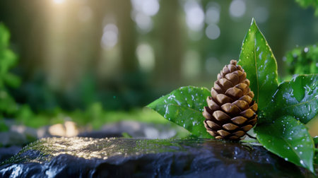 Forest ambiance with pine cone resting on damp green leaf, evoking freshness and tranquility