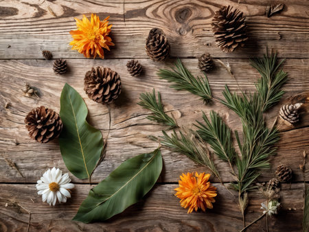 creative flat lay of leaves, berries, and twigs, created with generative ai