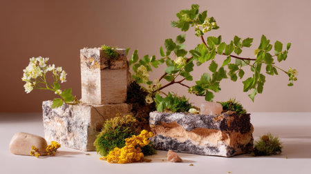 A beautiful arrangement featuring stones, delicate flowers, and vibrant greenery, set against a soft background, perfect for inspiration and design.