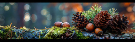 Pine cones and acorns rest on a mossy log in a forest. The background is blurred, showcasing a beautiful, natural bokeh effect. Sunlight illuminates the scene, creating a warm, inviting atmosphere.