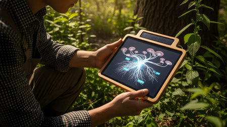Hands hold a wooden tablet displaying a digital mushroom network with glowing roots in a sunlit...